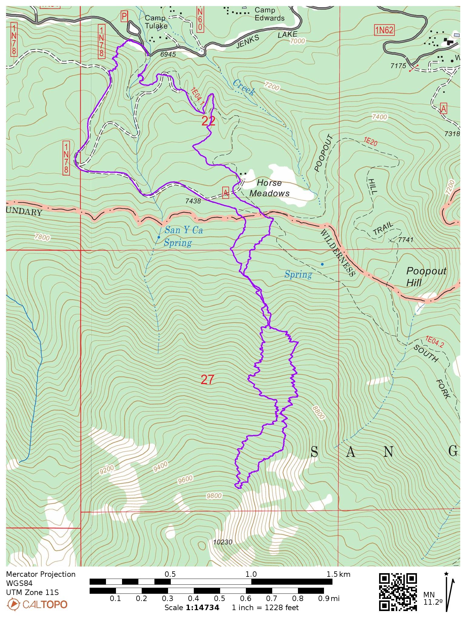 Route: There are two approaches to Alto Diablo. The most common is to follow the South Fork Trail up to Horse Meadows and then head uphill into the mountains. An alternative is to skin up forest road 1N78 from its intersection with Jenks Lake Road. The former is shorter but less likely to be ski-able on the way down, while the latter is longer but more likely to be ski-able. Pick your poison.