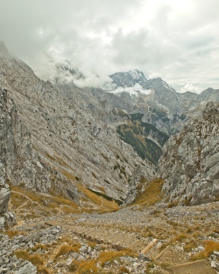 From Osterfelderkopf, we climb a little higher, following the Summit Adventure Trail for a short distance, and then fork off onto the Rindersteig, the trail that will lead us into Höllental Canyon. We soon arrive at the top of the ridge and are treated to yet another awesome view, this time of Zugspitze, Germany’s highest peak, and the Höllentelferner glacier. Our path descends rapidly down a scree-filled chute, although the trail itself is well-packed and features more of the stairs we encountered earlier near Kruezeck peak.