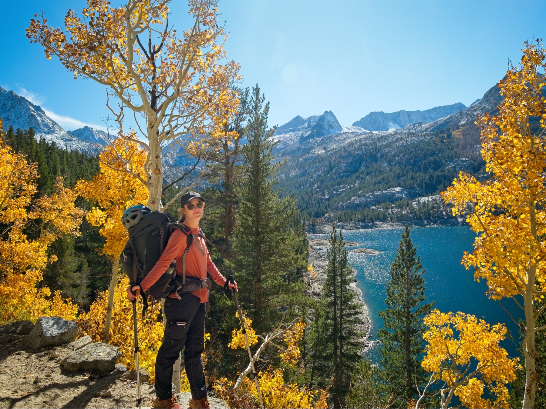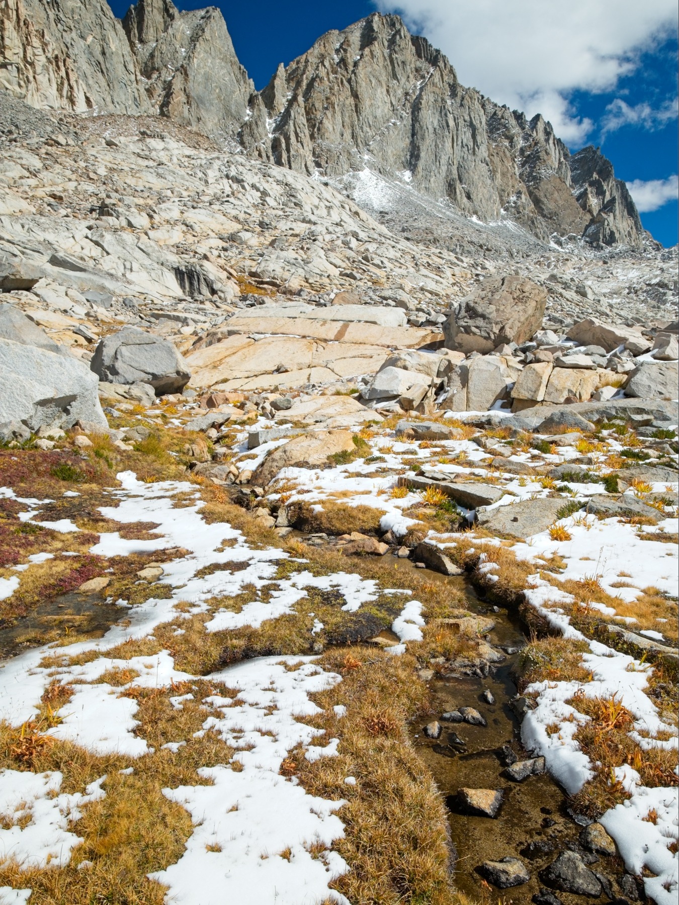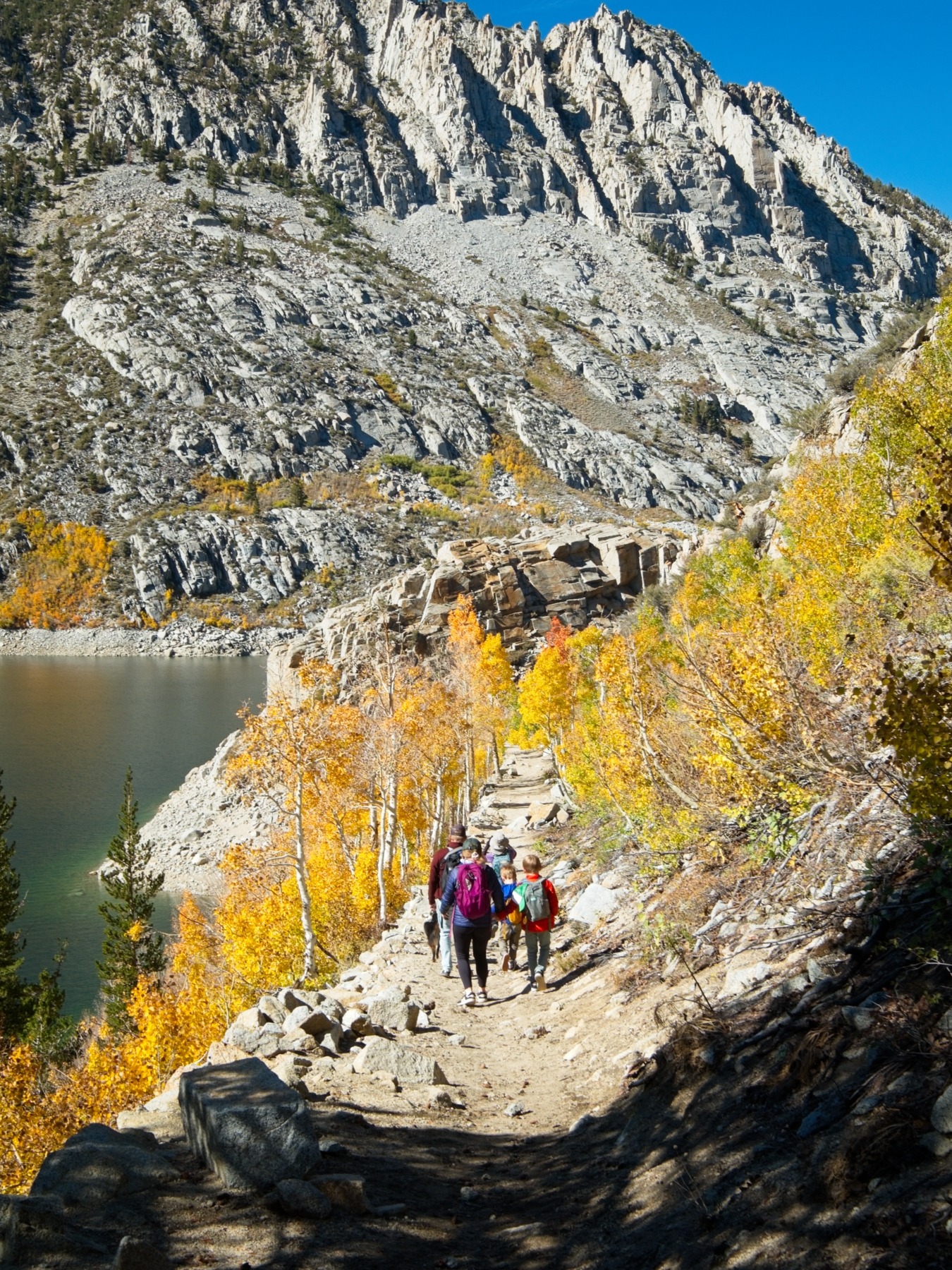 Shannon and I drive up from LA to Bishop, arriving at about 1:00 for a delicious lunch at the Great Basin Bakery. We then take the road up to South Lake and gape at all of the brilliantly-colored aspen trees in the canyon. I’d love to spend the entire afternoon up here, looking for composures, snapping photos, etc., but we do have to hike this afternoon. Note to future self: make plans for autumn photography up here!
