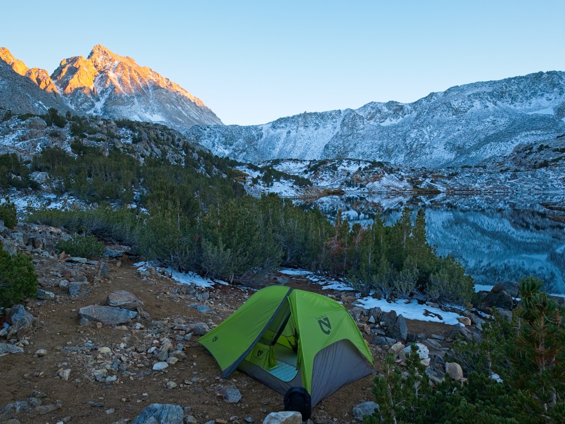 So we return to the Bishop Pass trail and hike back toward camp. The snow thins out as we descend, though the switchbacks below the pass are still completely covered. We reach Saddlerock Lake a little after 4 PM and enjoy a few hours of relaxing, reading, and lounging around camp. We briefly consider jumping in the lake but settle for soaking our feet when the water is (predictably) ice-cold.