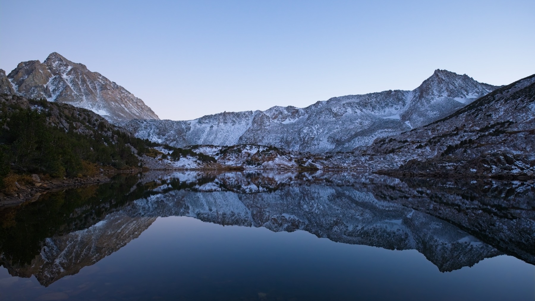The trail quickly climbs up above South Lake and disappears into the woods. I can feel the altitude immediately as we hike uphill – a little light-headedness and that burning feeling in my legs… We are at 10,000 feet, so it’s warranted, and I haven’t spent much time at altitude recently. Higher up the trail, we begin to see patches of snow, and then mostly snow, hinting that more than an inch fell this week. The trail remains mostly dry, though, and the lingering snow is gorgeous, its cold blues contrasting against the warm autumn foliage.