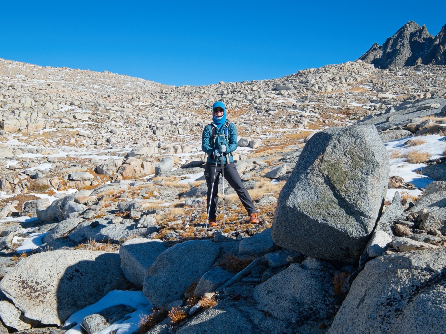 The trail up Bishop Pass is almost completely covered in snow and is frozen solid this morning, but it’s not particularly slippery; we’re able to walk up the trail without extra traction. We reach the top at 9:20, having covered about 2 miles, and set off cross-country. The sun hasn’t peaked over the mountains yet, so it’s still frosty in upper Dusy Basin. We soon discover that much of the talus is coated in ice, making rock-hopping over the snow a precarious business. The snow is much more than an inch deep too – in some places it covers my shoe entirely.