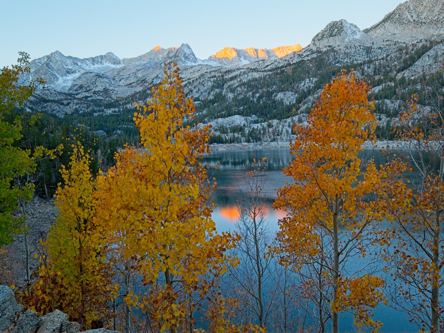 By the time we reach South Lake, the sun is just rising and the peaks across the lake are tipped in orange and pink. Shannon notices that the apsen trees have changed a lot since Saturday: the green leaves are now gold and the gold leaves are now brown and falling. I didn’t realize they changed so quickly, so I’m glad we were here to see them a few days ago!