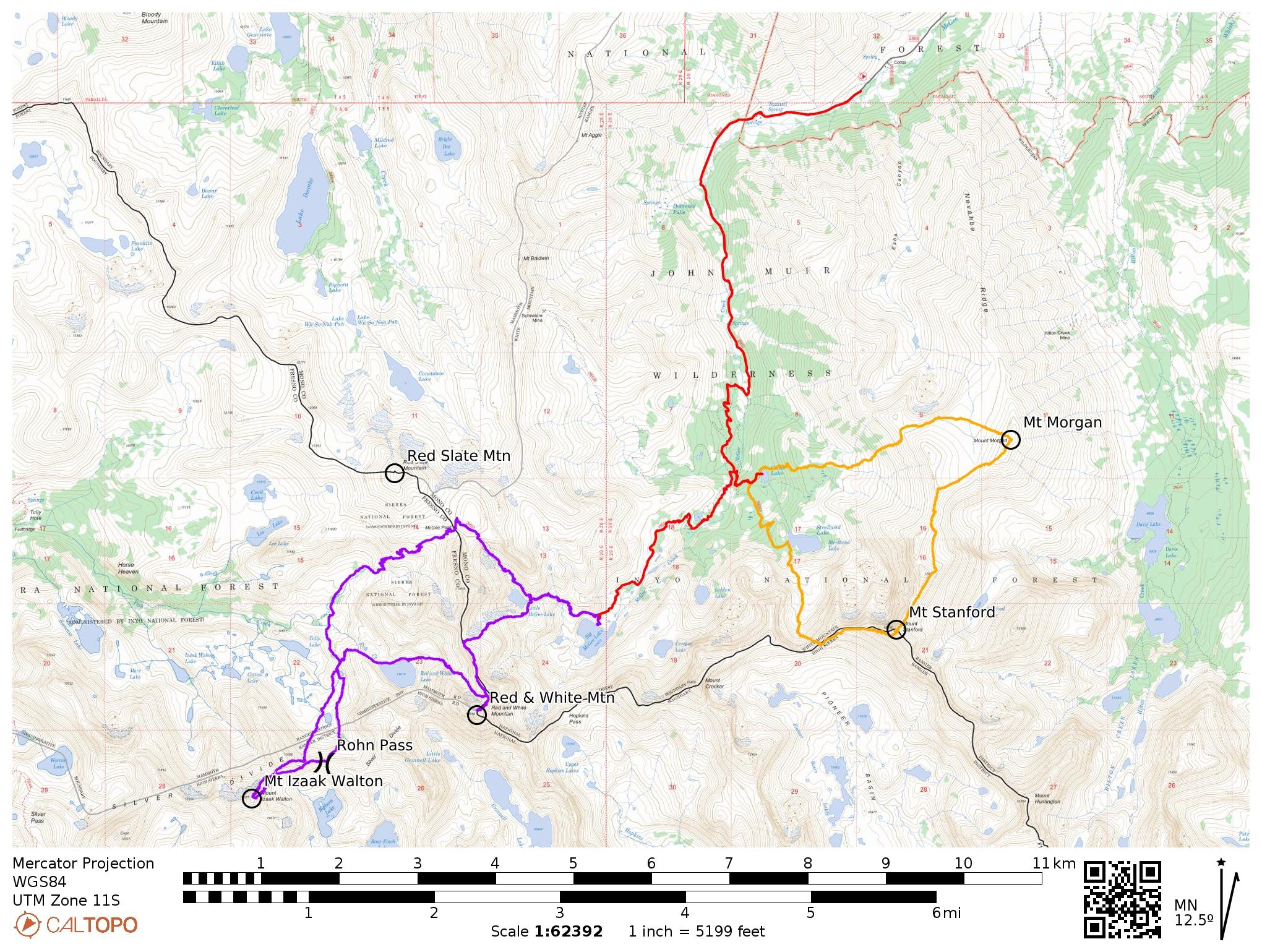 • Mt. Izaak Walton | Northeast Ridge (class 3) — From the summit of Red and White Mountain, descend back to the northeast ridge and then make your way down the canyon to Red and White Lake, passing it on the north side. Hike around the ridge that is south and west of the lake, descending into the Tully Lake basin. Some easy cross-country travel due south leads to Rohn Pass, where you turn west and traverse across the ridge to the obvious saddle below the northeast ridge of Mt. Izaak Walton. The most straightforward route to the summit follows the ridge all the way up, but I had a difficult time keeping this to class 3 and climbed some class 4 terrain as well. To descend, backtrack to the Tully Lake basin and hike over to the McGee Pass Trail; this path leads all the way back to Big McGee Lake.