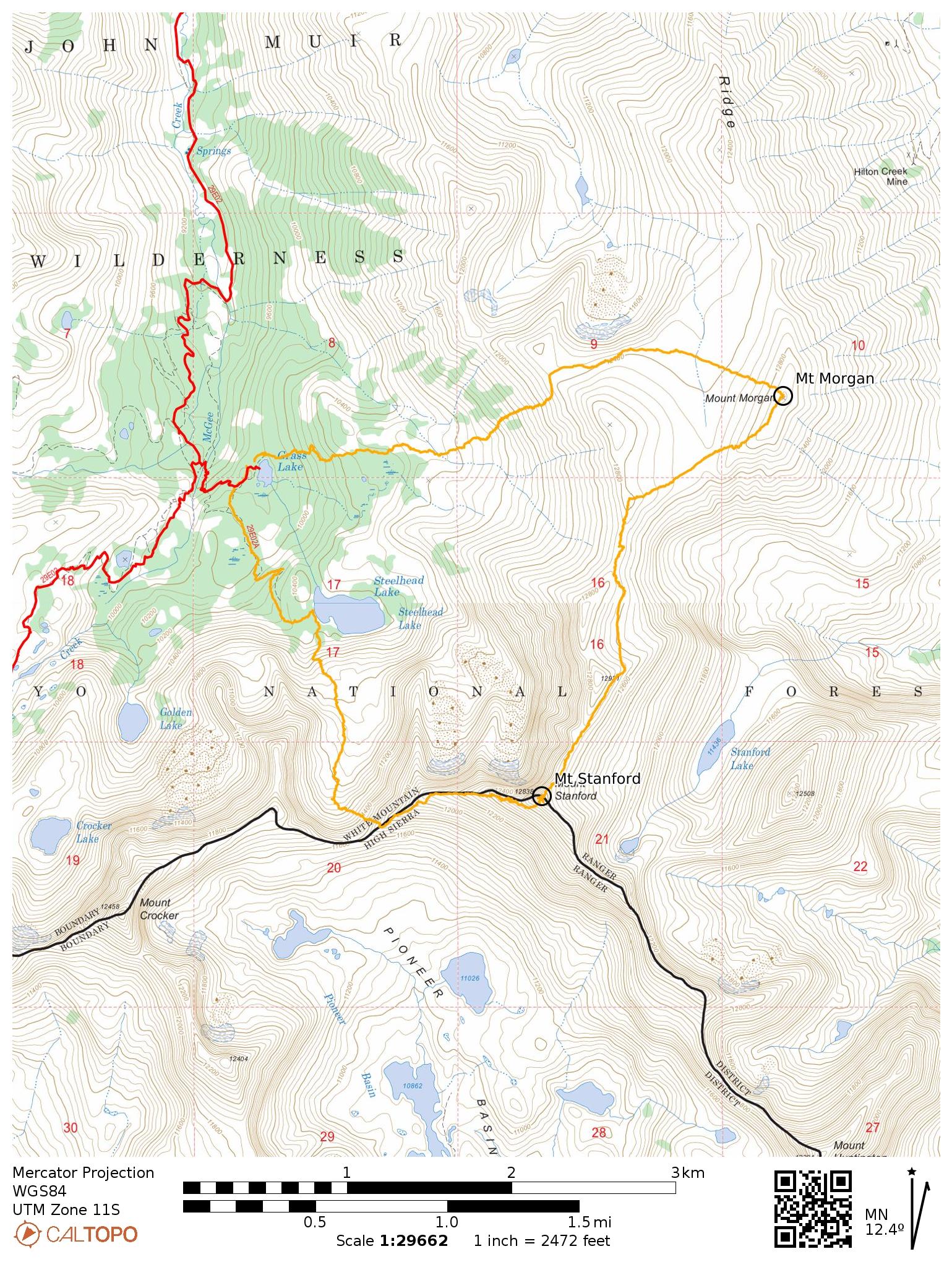 • Mt. Morgan | Traverse from Stanford (class 3) — From Mt. Stanford, continue northeast along the ridge toward Mt. Morgan. This is mostly class 2 terrain, but the section just south of Esha Peak is sustained class 3. On this section I mostly stuck to the top of the ridge, only dropping down occasionally to get around small cliffs. Past this ridge, enjoy the sandy class 1 – 2 walk to the summit. To descend back to Grass Lake, hike over class 1 – 2 terrain to the saddle northeast of Esha Peak. Descend down the west-facing slope through class 2 talus to the obvious sand-filled chute and slide your way down to the flatter terrain below. A little cross-country hiking and bushwhacking in a westerly direction gets you back to the lake.