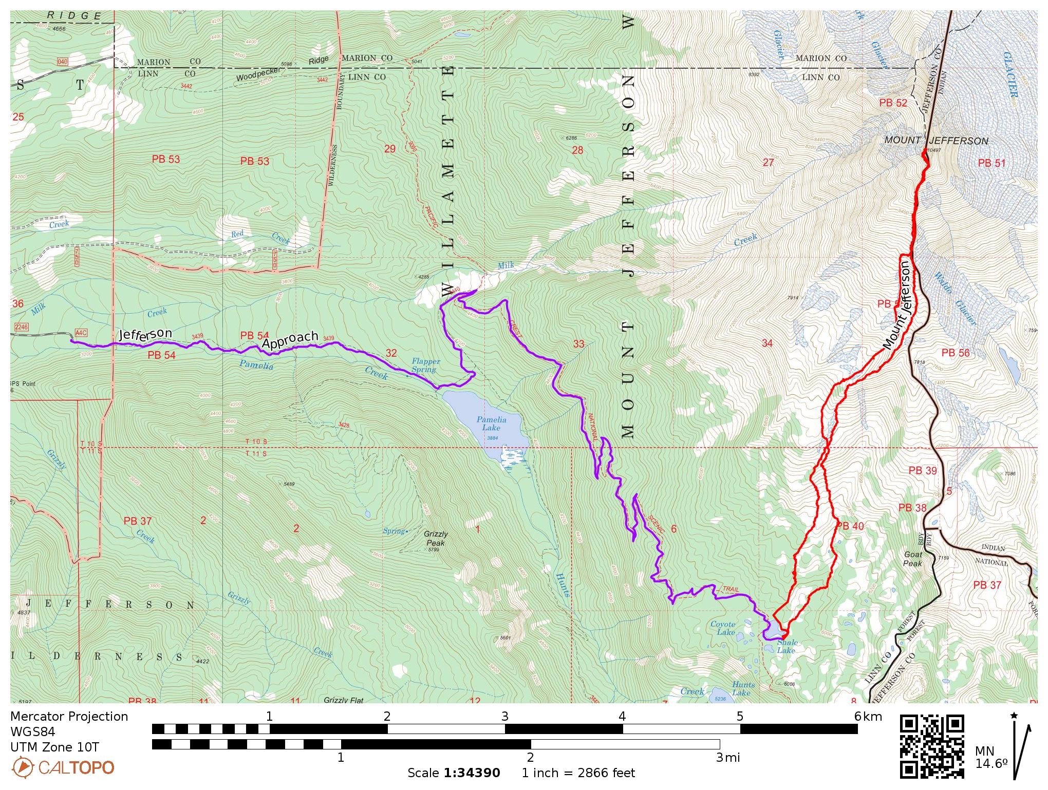 Route: Follow the Pamelia Lake trail and then the PCT to Shale Lake. A climbers’ trail heads north from the east end of the lake, as seen in the right-most red track on the map below. Choose your own route up to the south ridge; I suggest stringing as many snowfields together as you can since the loose, sandy soil is no fun to climb through. Follow the class 1 – 2 south ridge all the way to the “Red Saddle,” the obvious saddle just below (and south of) the summit block covered in red, sandy soil; the terrain immediately before the saddle is class 3 – 4. Our route across the snow follows the rimaye and then cuts directly up the snow to the summit. A short (50 – 100 feet?) class 3 – 4 scramble leads to the top. With less snow, some authors cite this route as easy 5th class rock.
