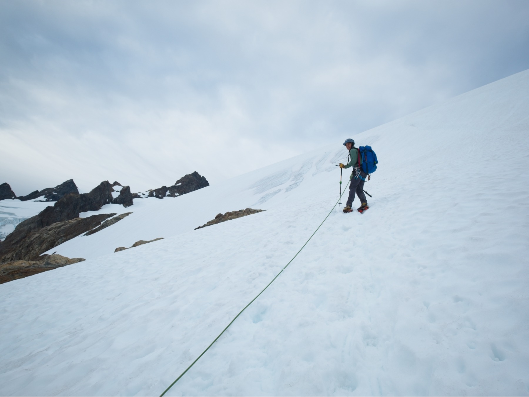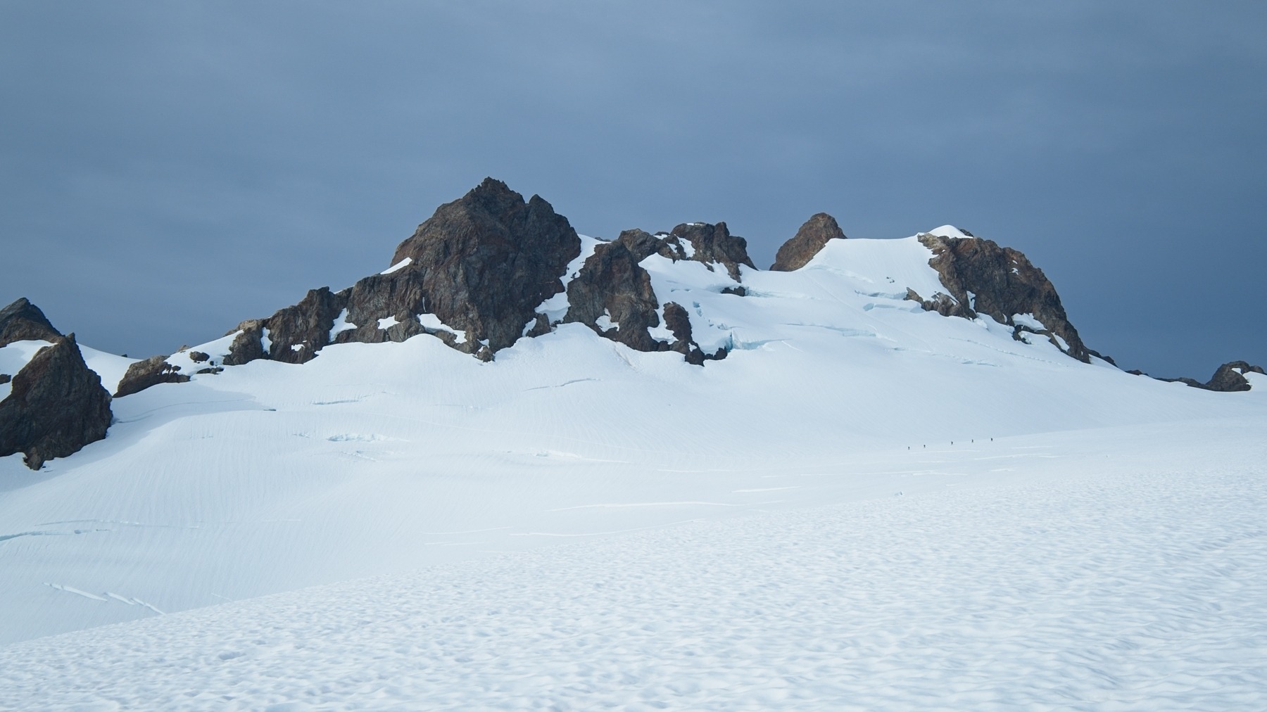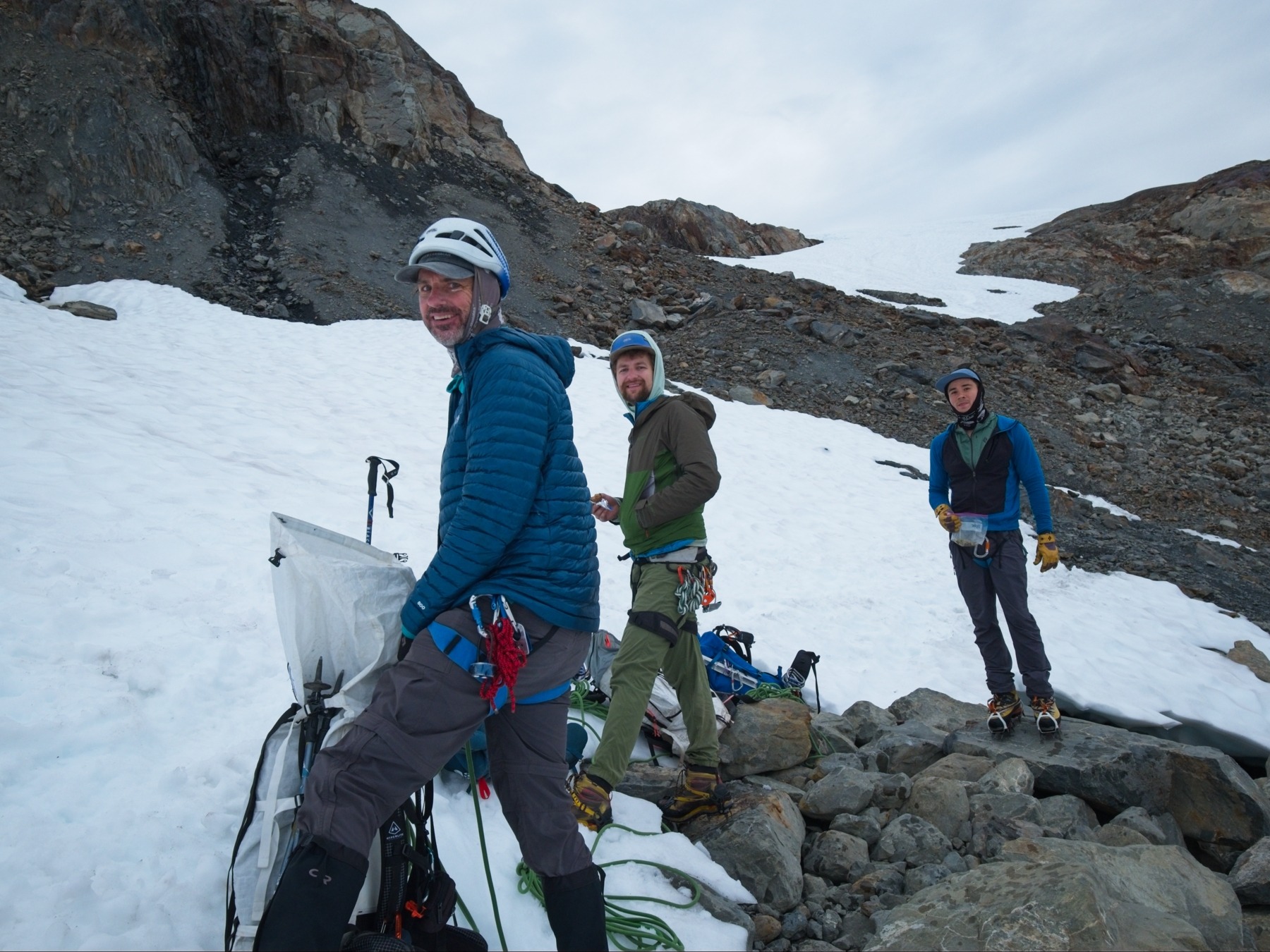 The sun finally appears in full at noon as we pack up the climbing gear just below the summit. The light reflects off of every surface as we descend down the glacier and I’m soon dripping sweat. Hiking down the snow goes faster than the ascent, even though it feels very long; it only takes us two hours to reach the lower glacier.
