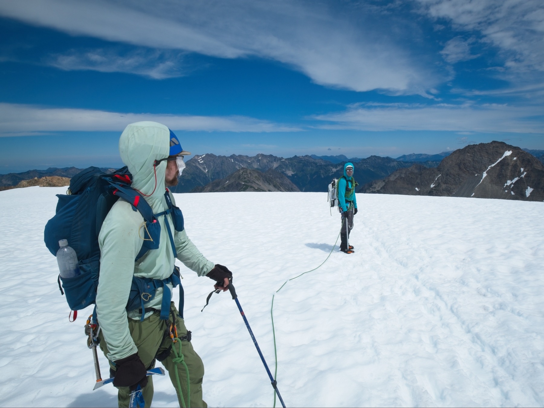 Dawn alpenglow floods the upper ridge of Mount Olympus as we set out across the glacier. It’s a beautiful mix of colors, with pinks and oranges up high and blues down here. Josh leads the rope team and sets a quick pace across the ice. We step across myriad rivulets of gurgling melt water and over a few stomach-clenching crevasses, but it’s generally a flat, easy walk.