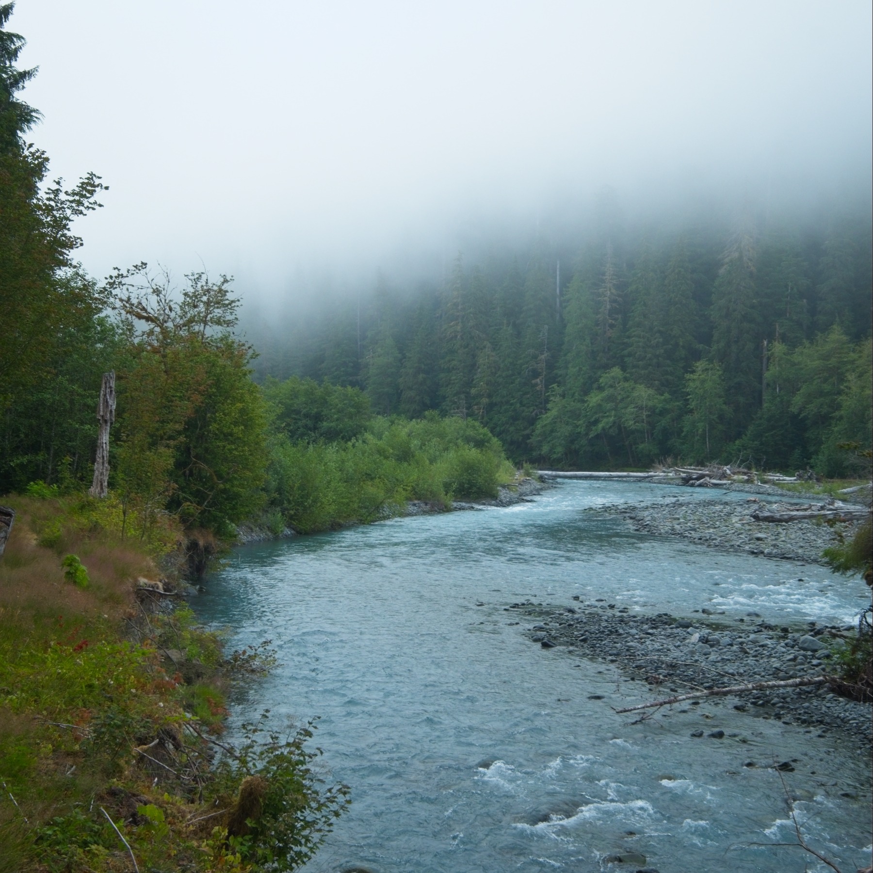 I find Craig, Cody, and Josh again at a small creek that runs into the larger Hoh River. We hang out for a few minutes, munching on snacks and checking out the water. The entire river is light blue with glacial chalk, and the stones at the rivers edge are coated in a thin layer of the stuff. Standing here in the warm, humid rainforest it’s strange to imagine all that ice 15 miles up the trail.