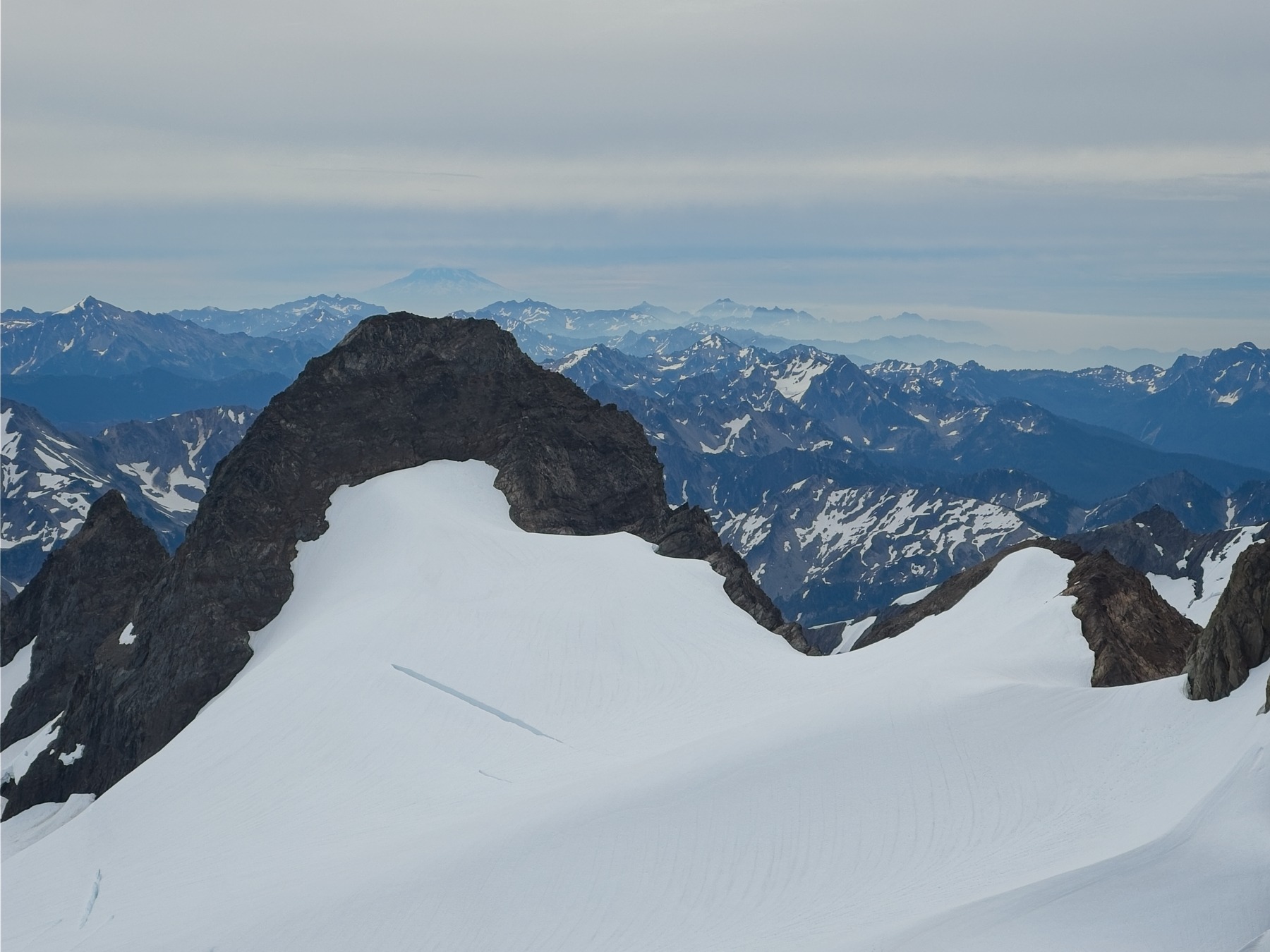 We soon reach a steeper slope, the apron of “Snow Dome,” an expansive, snowy plateau about 1000 feet below the summit. Hiking up the slope is easy enough although the person that set the boot track must have been tall; the steps are uncomfortably far apart! We take another short break at the top of the steep section to eat more snacks and admire the view. The true summit is the “West Peak” of Mount Olympus, with two other sub-peaks, the Middle and East Peaks, to the side. There are several routes to the summit: the “Autobahn” and “4th of July” routes take a relatively direct line from Snow Dome to the summit. Those are inaccessible now since the snow bridges that spanned the bergschrund and several enormous crevasses have melted. We’ll instead follow the “Cyrstal Pass” route, a less direction option that winds around to the east through a gap in the ridge.