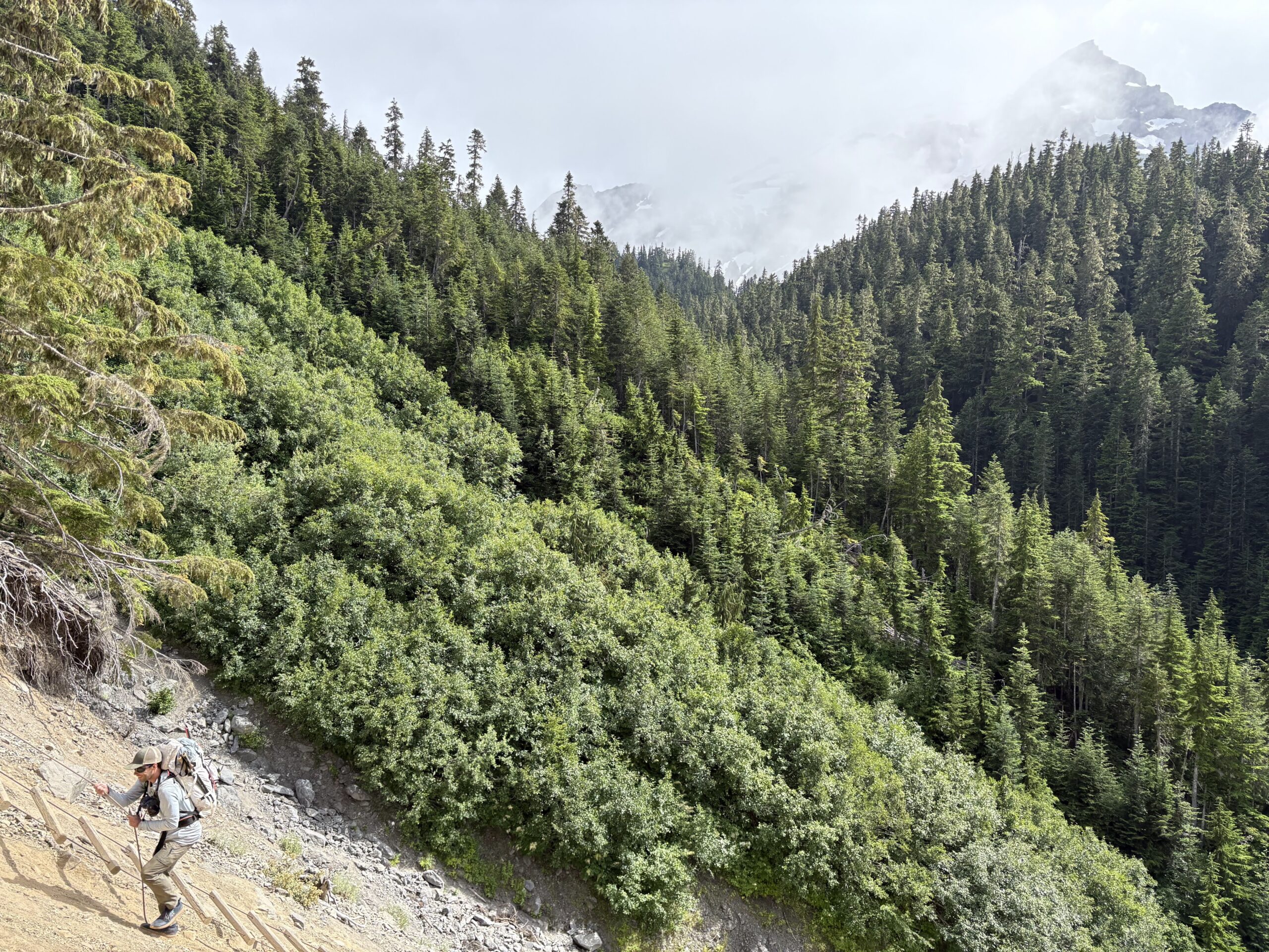 We reach Glacier Meadows at about 3:45 PM and make a plan for the rest of the afternoon. Craig and I need to be to the airport tomorrow evening by about 5 PM, and the drive back to Seattle takes 4.5 hours, so we’ll need to be at the trailhead by noon. There are roughly 17.5 miles of trail between us and the trailhead. To avoid another very early morning, we’ll pack up our camping gear at Elk Lake (14.5 miles from the trailhead) and carry it downhill to Lewis Meadows, which is only 11 miles from the trailhead. This means we have a lot more walking to do today, but we have many hours of daylight left.