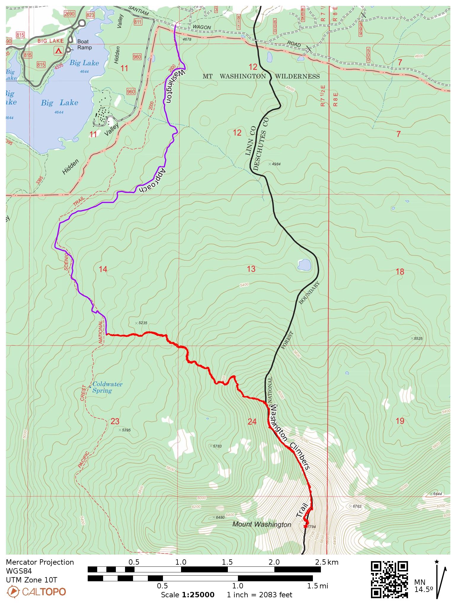 Route: Begin at the PCT junction with the Santiam Wagon Road near Big Lake. Follow the PCT south about 2.7 miles to the climbers’ trail. This well-worn path climbs up to the north ridge of Mount Washington. Pass the gendarmes just below the summit block on the west side and scramble up a loose gully to a notch. Two ramps lead up and to the left on climbers’ right; scramble up the second, higher ramp (class 3) and climb a 10 – 15 foot wall to a set of slings. From here, choose your own class 3 – 4 adventure to the summit, taking note of the many rappel stations you can use on the way down.