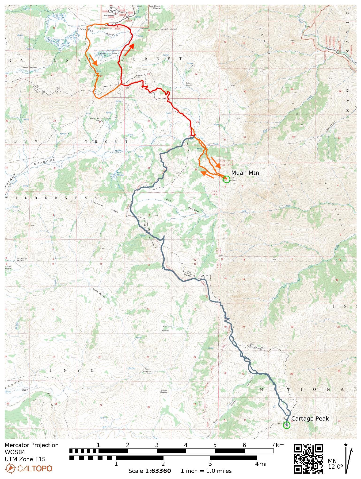 Route: Begin at the Cottonwood Pass Trailhead and hike up to Trail Pass, continuing southbound on the PCT to Diaz Creek. Leave the trail here and climb cross-country (class 2 at the highest) up the sandy northwest slope of Muah Mountain. There are several false summits; the true summit is the furthest across the ridge (as usual!).