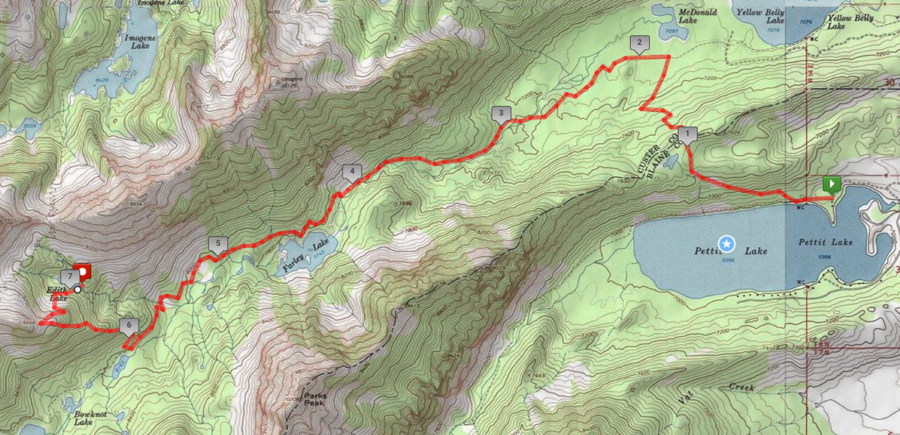 Route: Begin at the Tin Cup Trailhead at Pettit Lake. Only a short distance down the trail, leave the lake behind and head uphill on Trail 041. At the junction just west of Yellow Belly Lake, head west on Trail 096 toward Farley Lake. About a mile past Farley Lake, you’ll reach another junction. Take the northbound trail toward Edith Lake.